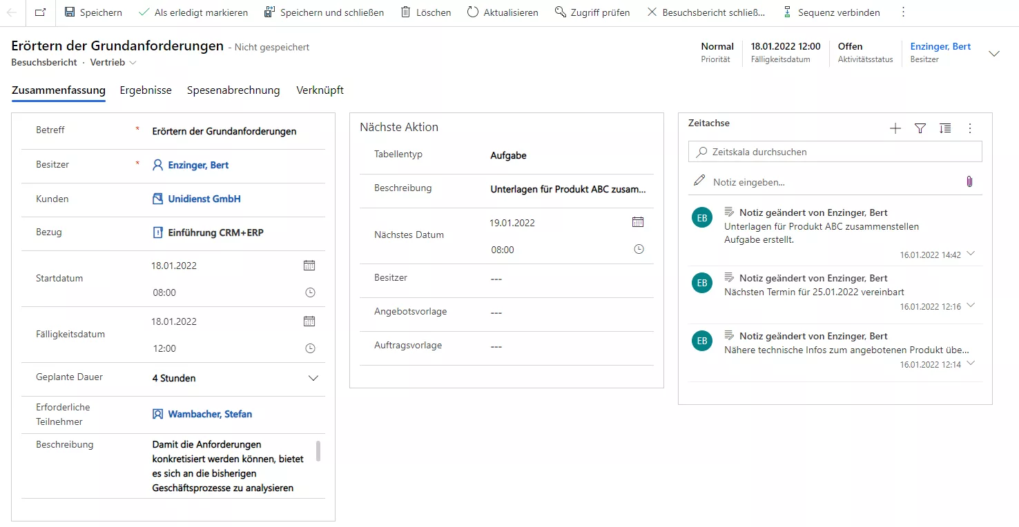 Da der Besuchsbericht im Bereich des Vertriebs angesiedelt ist, ist es wichtig, dass die Aktivitäten einer Verkaufschance zugeordnet sind, denn sie ist das zentrale Element. Sämtliche im Prozess ausgelösten Folgeaktivitäten müssen dort in der Zeitachse gelistet sein.