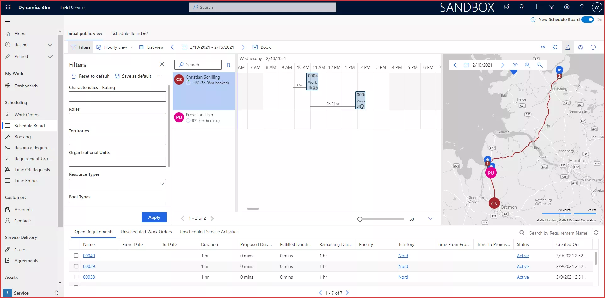 Open Requirements (offene Buchungen) und die Liste der zu planenden Aufträge dienen als Arbeitsvorrat für die Planung. Hier können spezifisch auf Ihre Service-Bedürfnisse gefilterte Ansichten bereitgestellt werden. Aus den Listen, die dort verfügbar sind, können Sie die einzelnen Aufträge / Ressourcenanforderungen buchen.